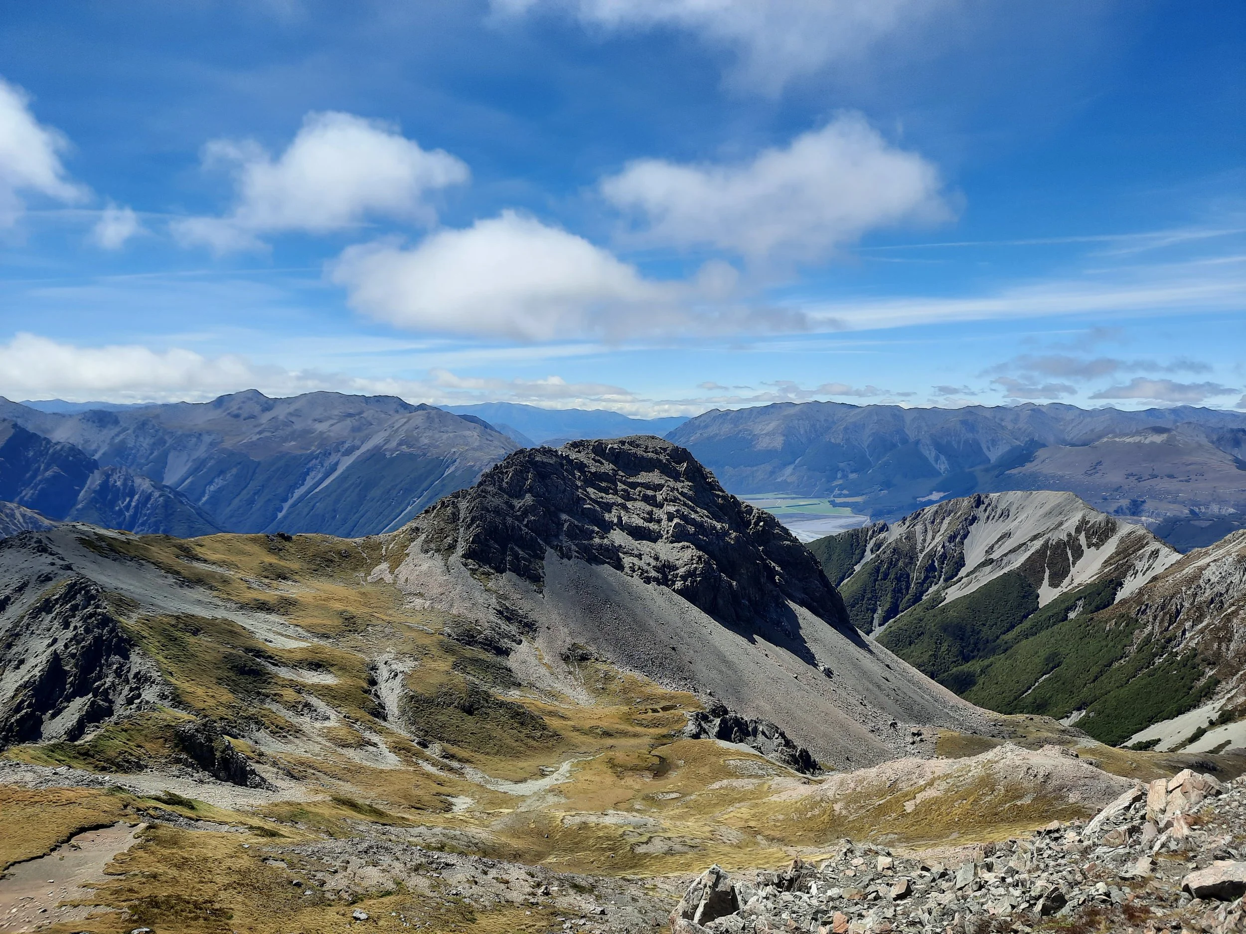 From Avalanche Peak. Descent route at left. Arrival route center-left. Mt Rolleston at right.