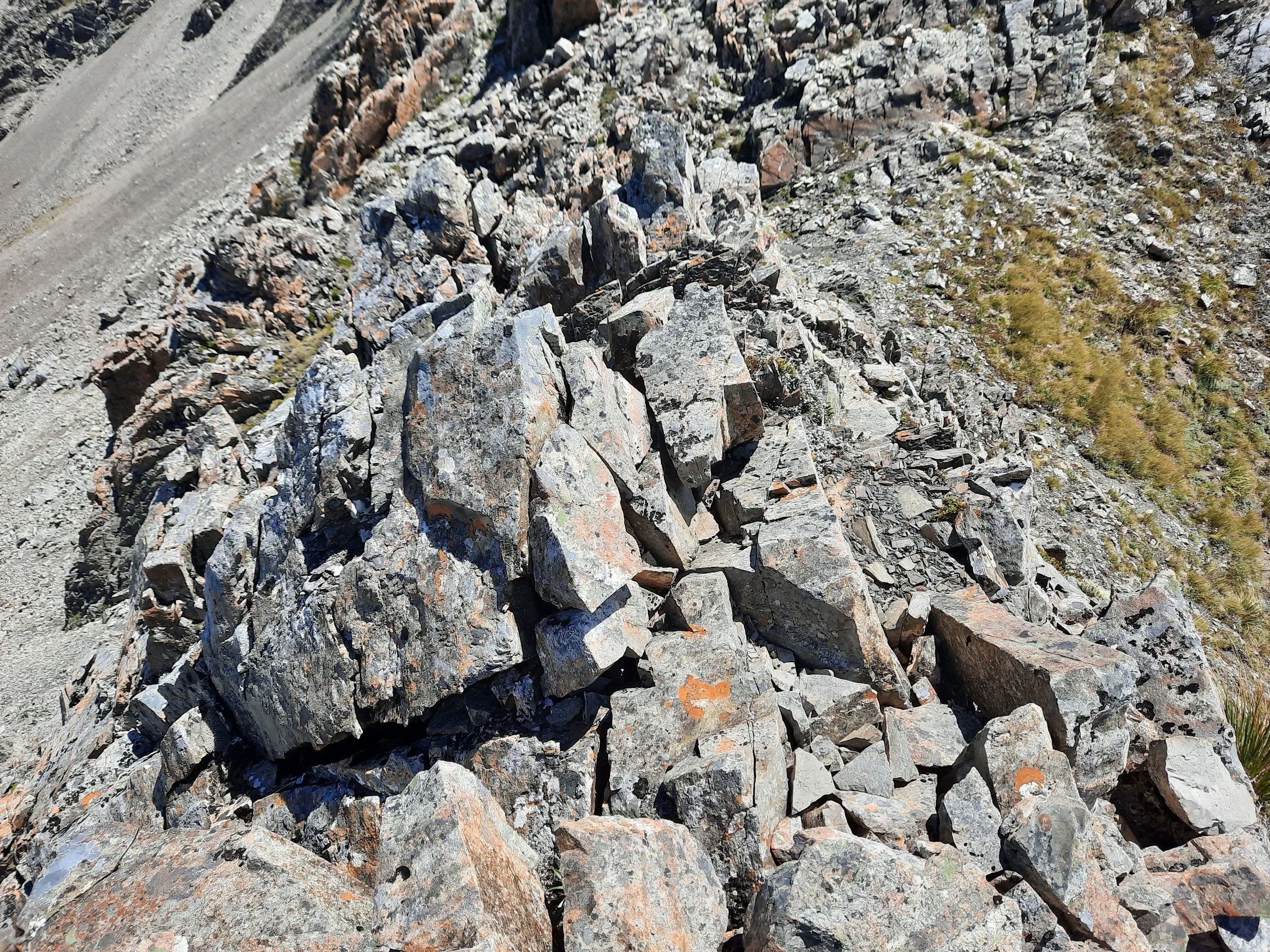 From Mt Bealey, I descended toward the first of the humps on the ridge. Of the various humps on the ridge, I climbed over some of them. Deeming others gendarmes, I sidled slowly along their western sides, or spent several minutes gingerly walking downhill and then past them on the huge scree slope below. It was slow and not so enjoyable. This section is indicated by the pair of cyan dots on the topomap screenschot.