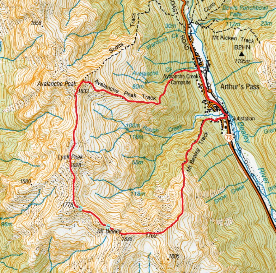 Arthur’s Pass is a village in Canterbury, South Island known for multiple long day-hikes accessible on foot on both sides of the valley. On the west side, Mt Bealey (1836m) and the well-known Avalanche Peak (1833m) can be combined in a traverse (either direction) which also crosses Point 1778 and Lyell Peak (1828m).