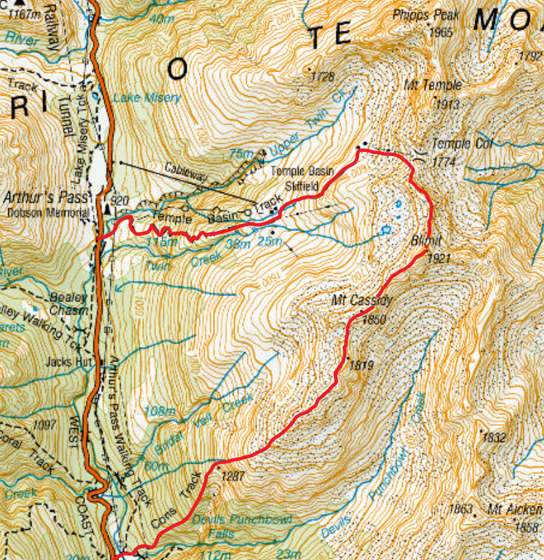 Arthur’s Pass is a village in Canterbury, South Island. It seems to be the best place in New Zealand for doing a variety of long day-hikes which are accessible on foot from the village. On the east side of the valley, Mt Cassidy (1850m) (via Cons Track) and optionally Blimit (1921m) too can be traversed to the upper basins of the Temple Basin ski area. Those basins are Bill’s Basin in the south (directly below Blimit), and Downhill Basin further north.