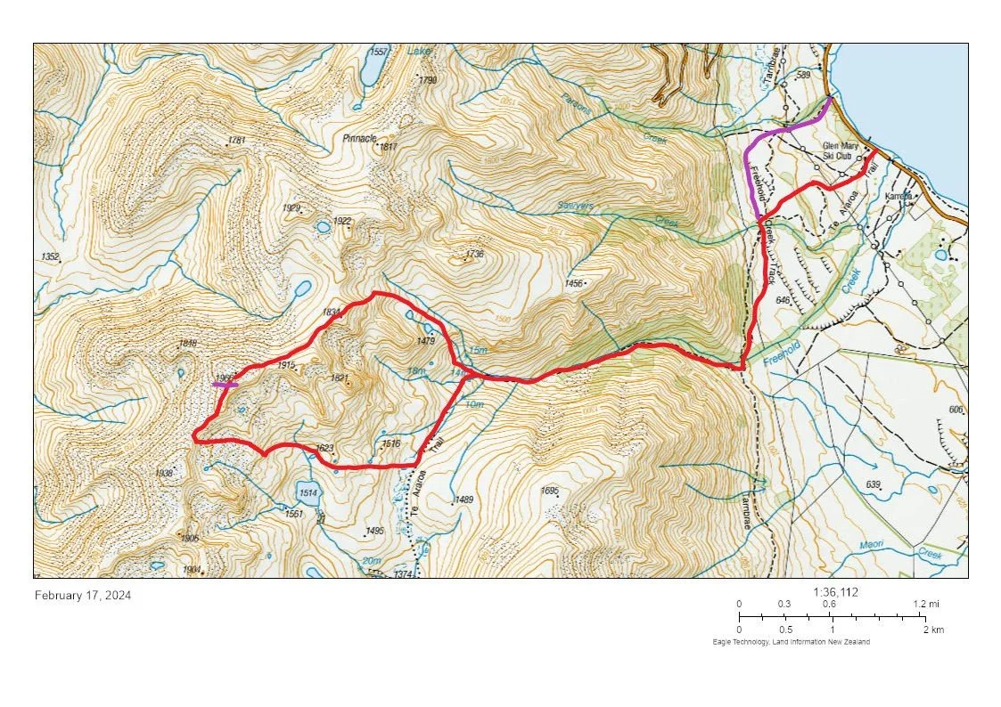 I started at Glen Mary ski club on Sawyer’s Creek track (part of the Te Araroa trail), which merged with the Freehold Creek track; next I headed through tussock, roughly following the beginning of the route to Lake Dumb-bell; then I ascended to the rocky tops featuring Points 1834 and 1966, before descending into a basin below Point 1966; and finally I regained the Te Araroa trail, which took me back the way I had come, passing back over Freehold Creek track and Sawyer’s Creek track.