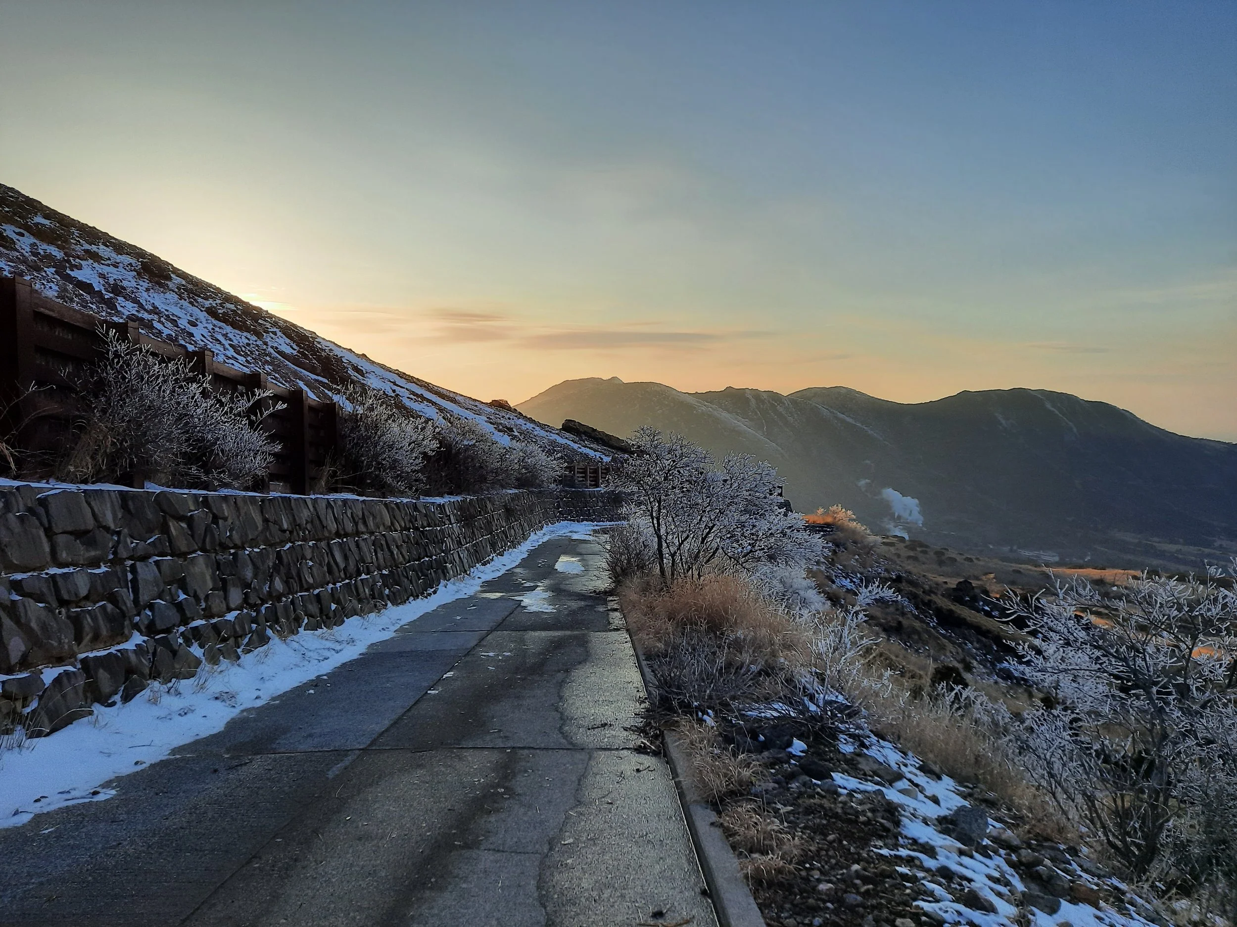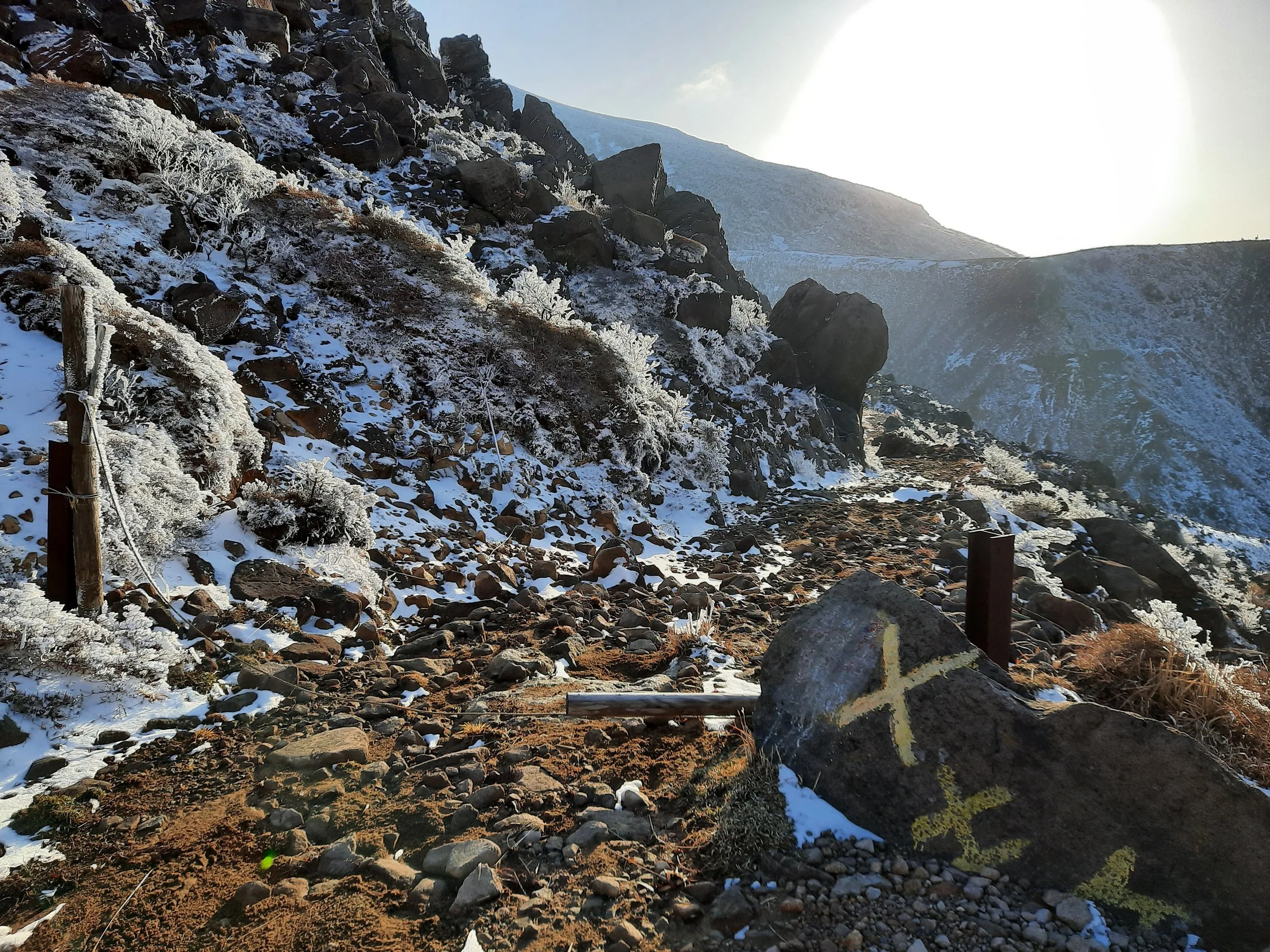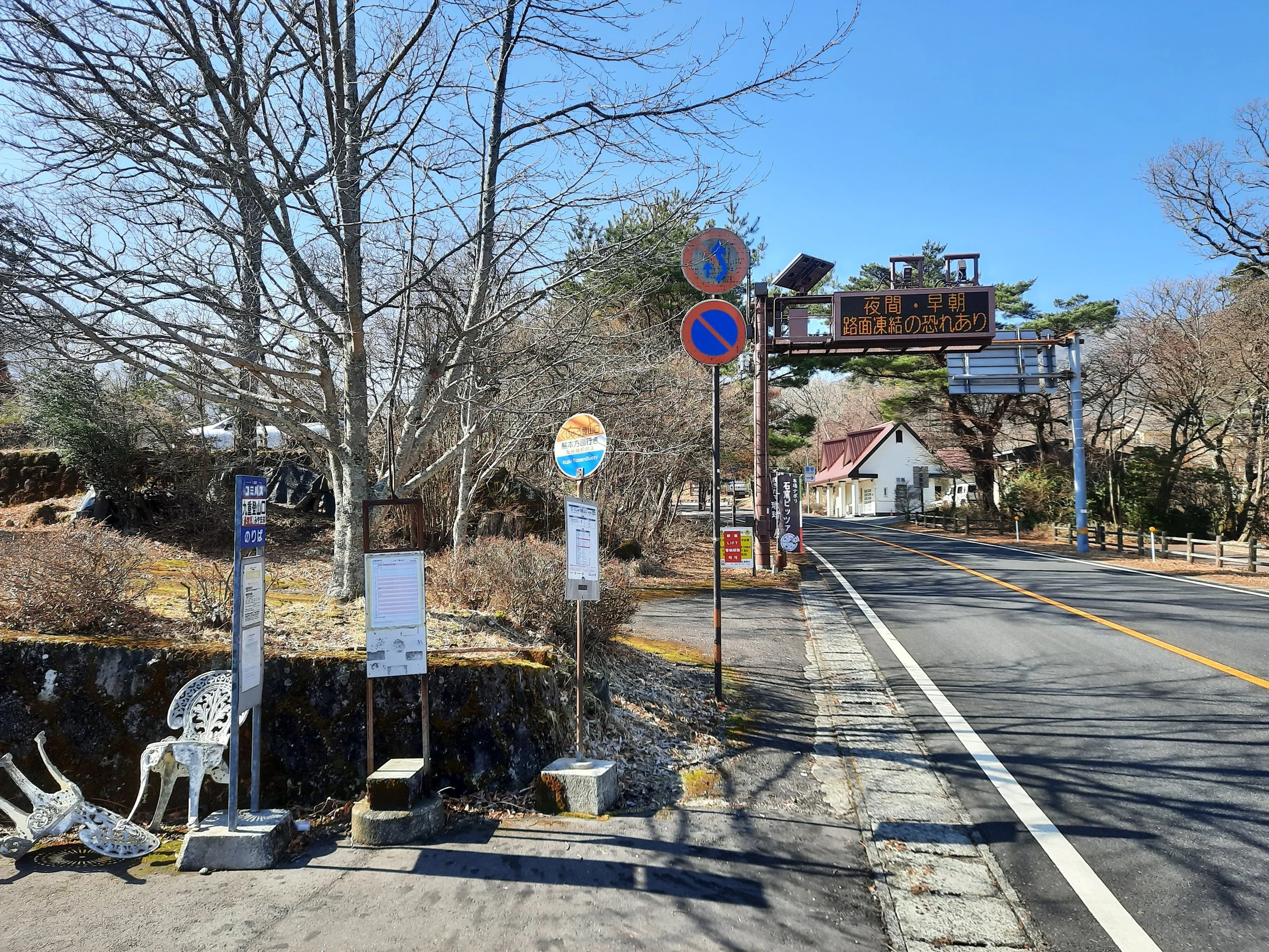 The trailhead has toilets, a cafe (Makinoto Pass Rest House), vending machines, and a medium-sized parking lot. I began hiking at the trailhead to the left (east/northeast) of the cafe. The wind was very cold, and I was glad I had spent around 45 minutes in the cafe waiting for it to weaken. Forecast wind chill was -16 Celsius in the morning (30kph wind) but only -8 in the afternoon (10kph wind).