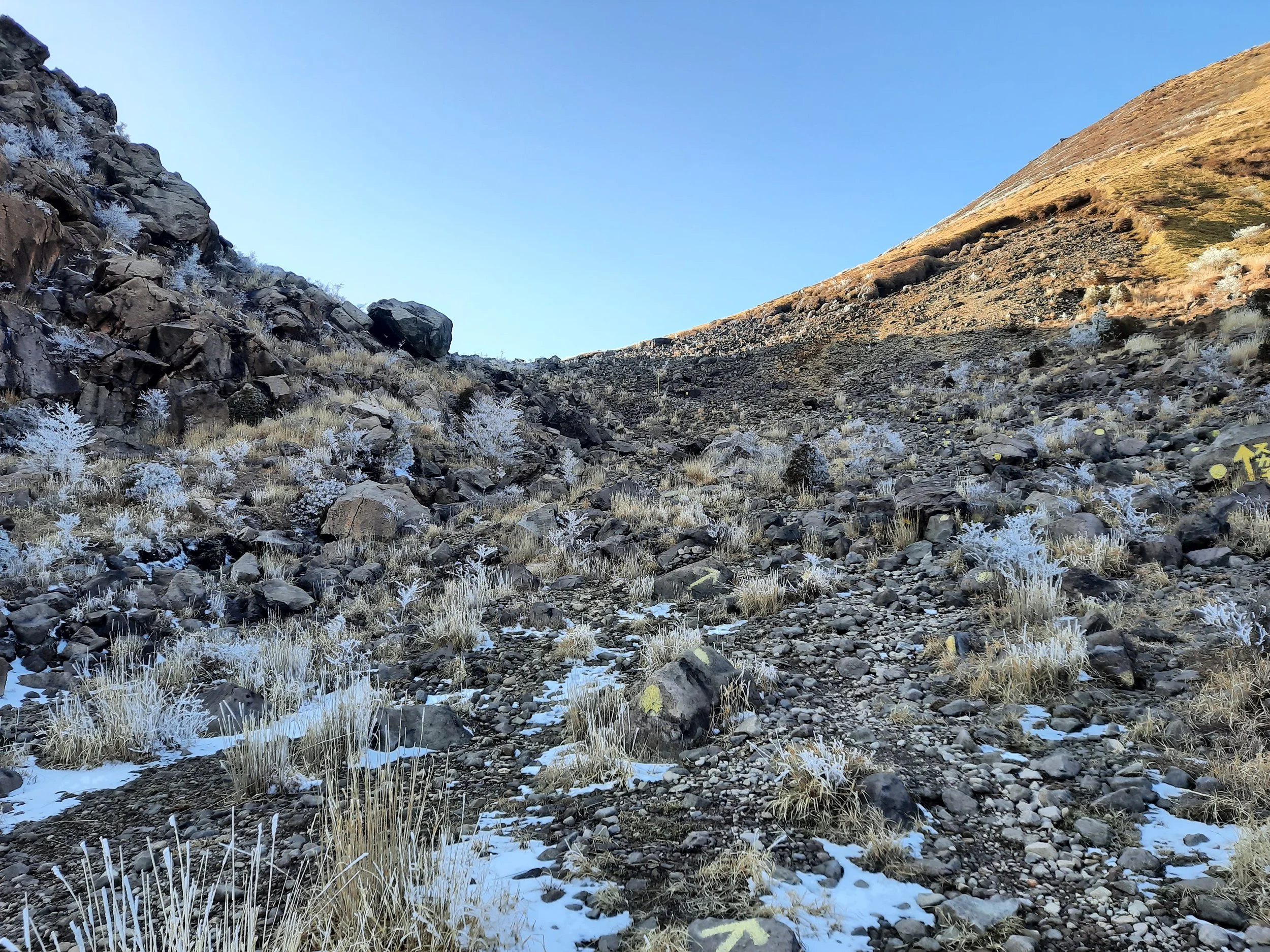 Initially I took a wrong turn down the formed stony track descending to the left, absent-mindedly stepping over the collapsed barrier meant to stop hikers walking there. After crossing a few old landslides obstructing the track, I check my maps app, and confirmed that this was a disused route. I spotted yellow posts in the distance below the pass on the southwestern slope of Mt Mimata, so re-traced my steps and descended there. This was a bouldery descent, with yellow spray paint again marking the way. Eventually the route crosses the valley, and one of several stone check dams built across the valley. On the other side of the valley, the route joins the formed stony track I previously took by accident, 40-50 meters below the place with the landslides. From here, the route was simple, and paved on-and-off. I passed the turn-off to Omagari trailhead and continued north toward the visitor center. There were several more deer, as well as a meadow bunting singing shortly after sunset.