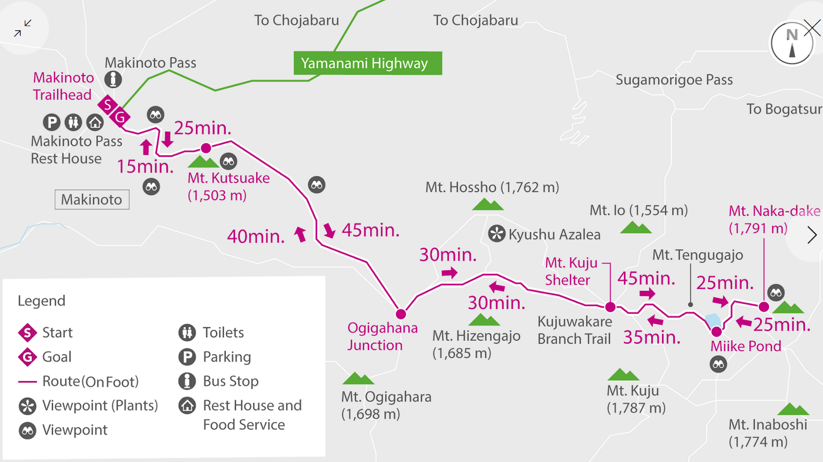 One map I saw gave 5 hours 15 minutes round-trip from Makinoto Pass to the high peak, Naka-dake, not counting rest. This map didn’t have my longer descent via Sugamori, or an estimate of the time to ascend Mt Kuju and go around the east of Miike Lake.