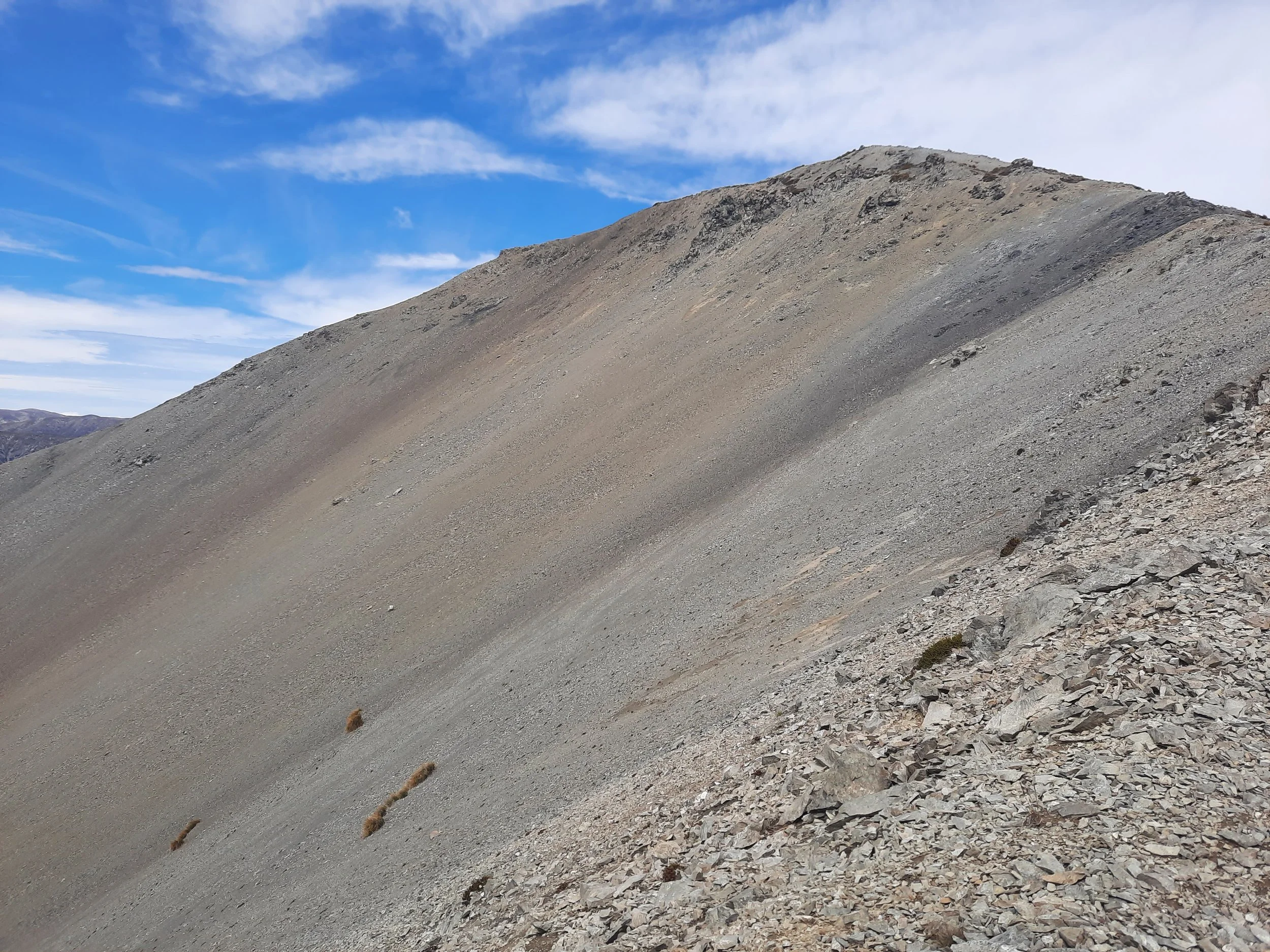 The walk to Red Hill was windy but otherwise uneventful. I followed an impact track much of the way. There were a few gravelly and somewhat narrow ridges connecting different humps in this chain of hills, but it was mostly tussock and dirt.