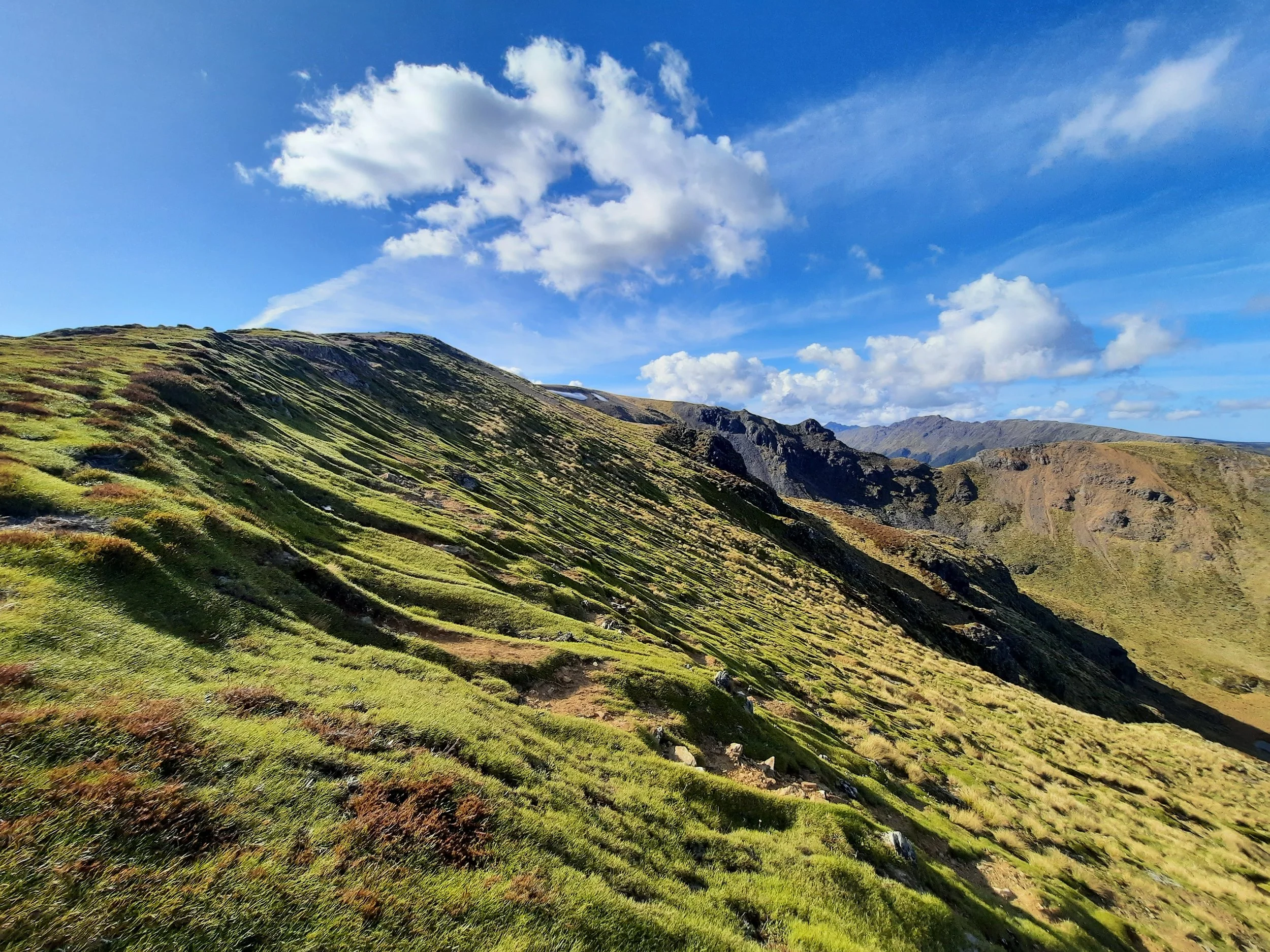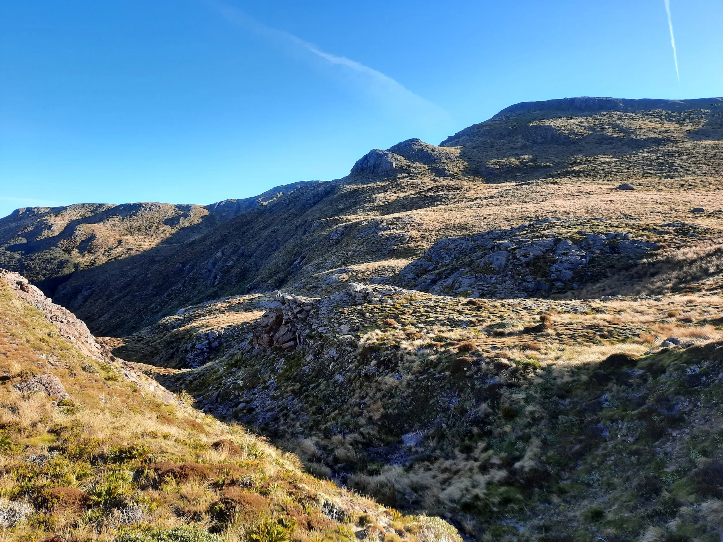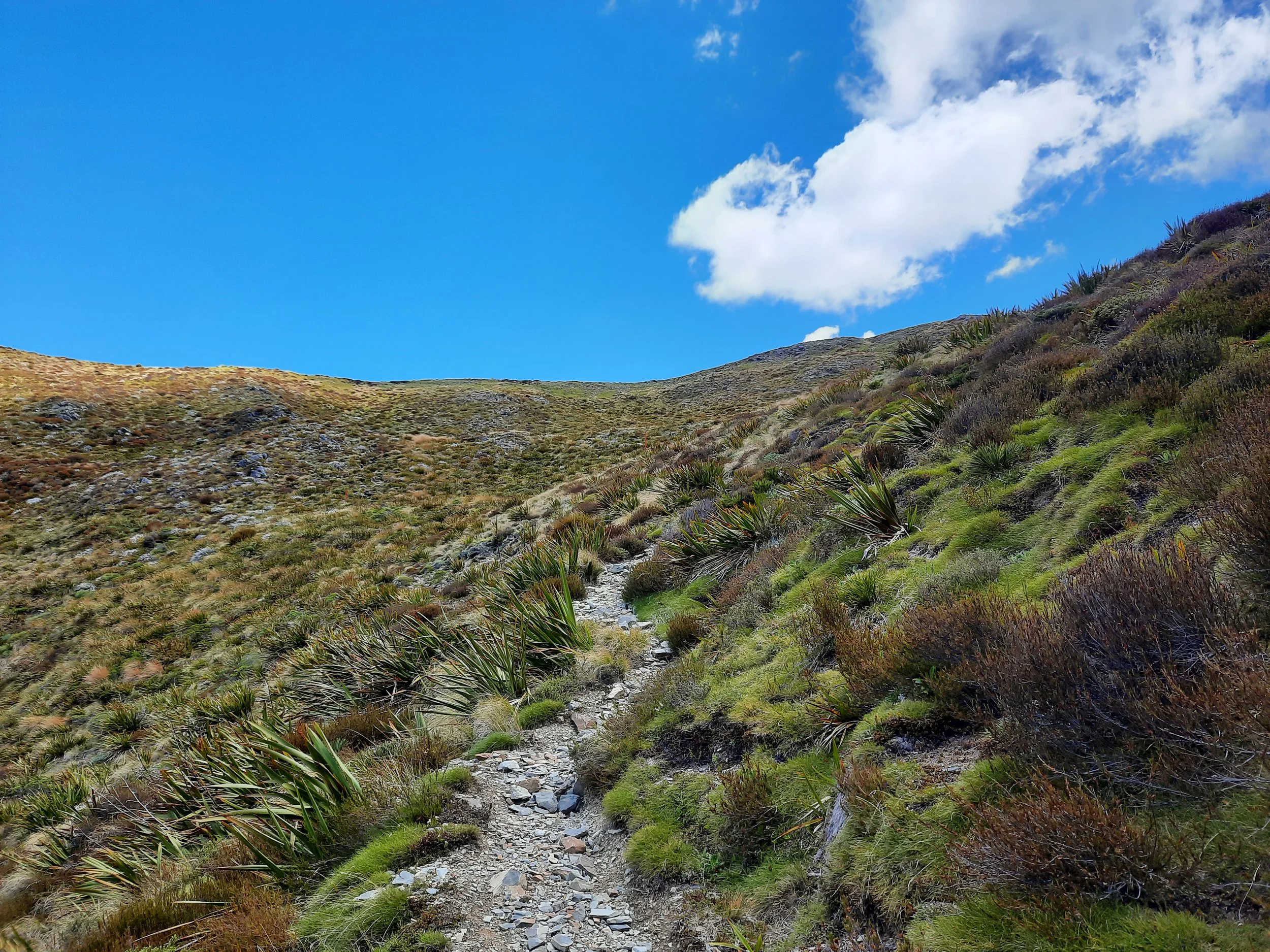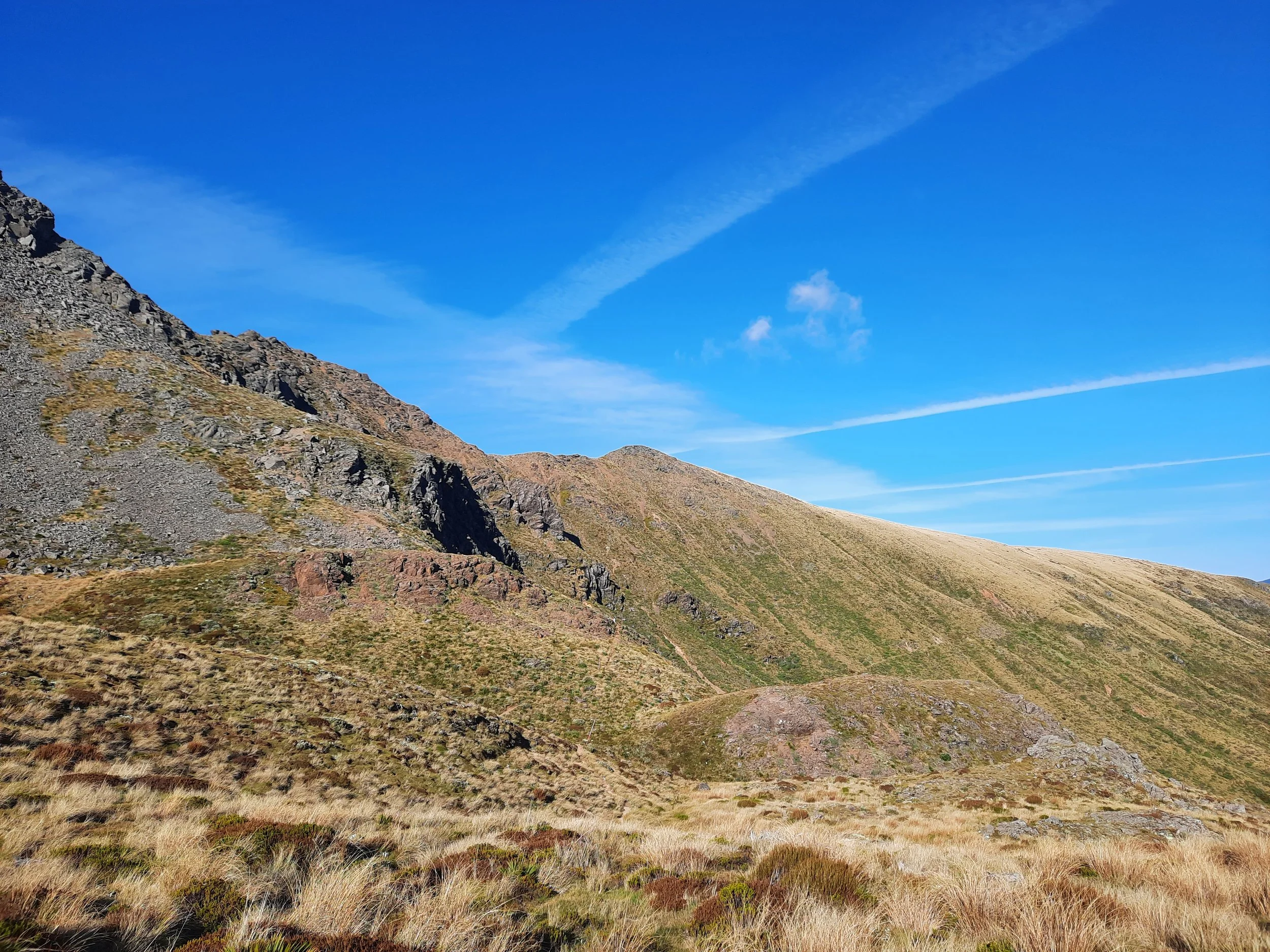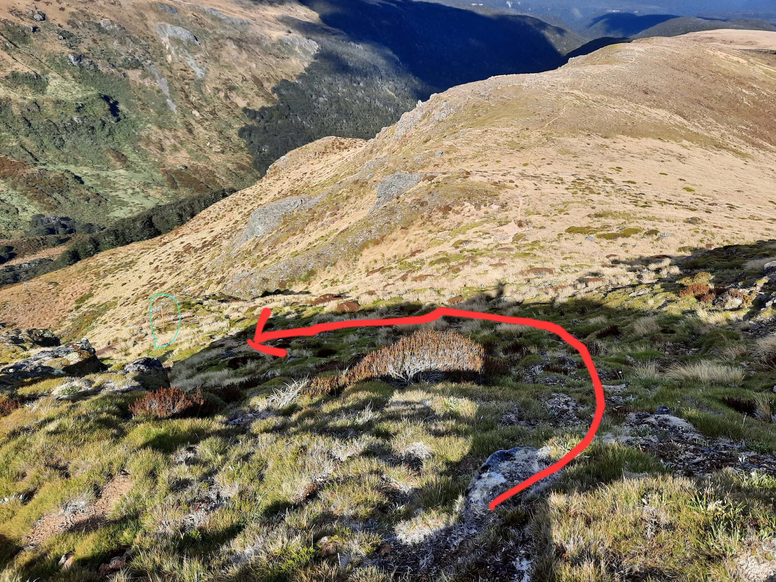 For the descent, I followed TinyTramper’s ascent/descent route. I walked along the gentle southwestern ridge of the corrie until I reached a cairn, then descended a tussock slope to an orange marker pole, and turned left (north) toward Lake Peel along the easy-to-see Balloon Hut track. The hut is to the south of my topomap screenshot. (It is presumably a good place to stay for a multi-day trek involving Mt Peel and Mt Arthur.)