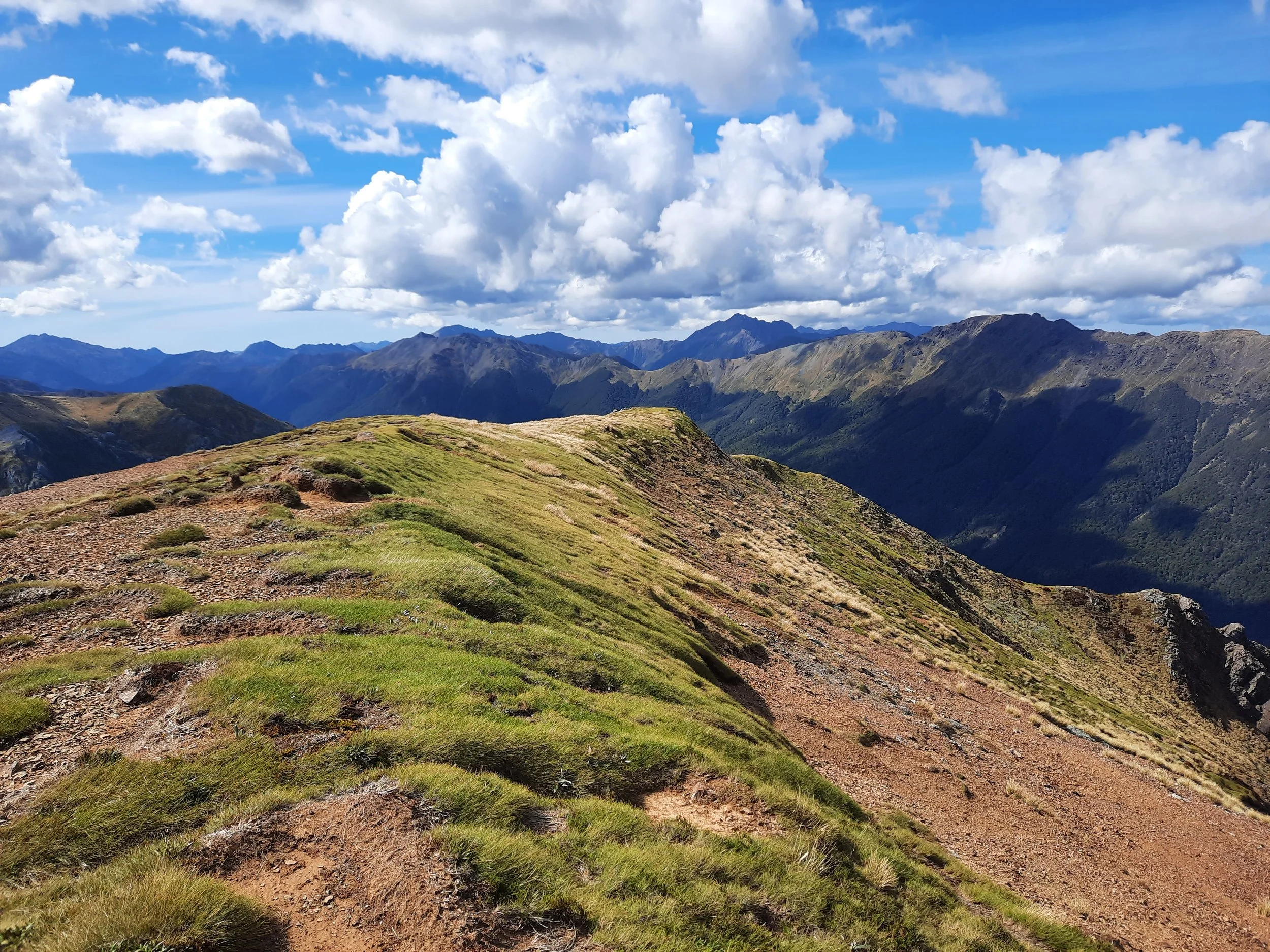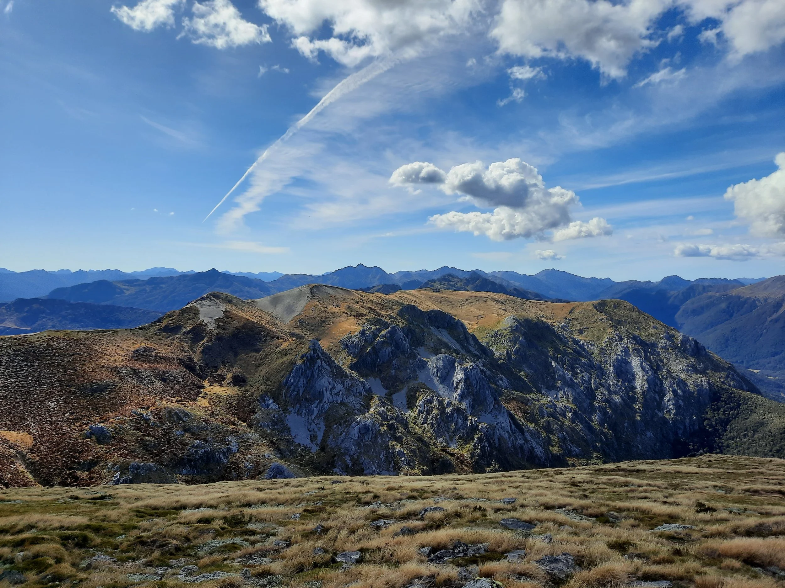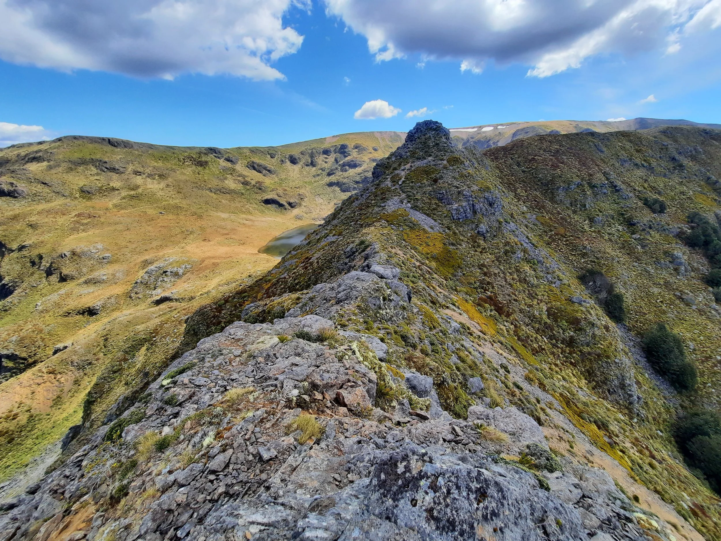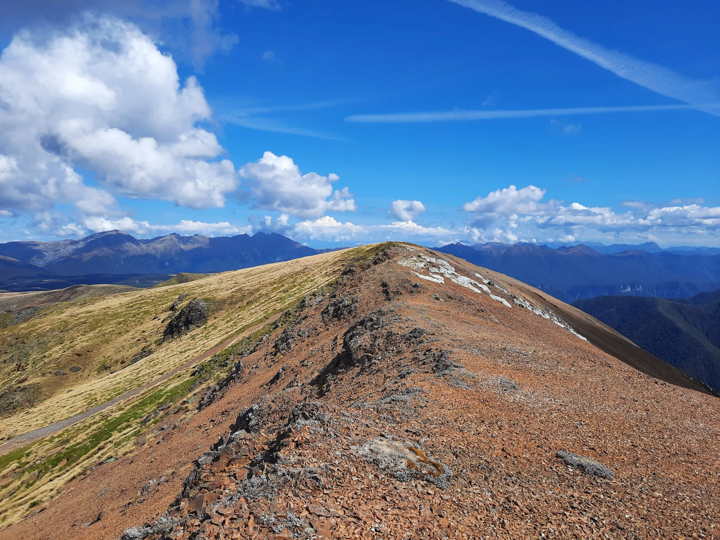 At the 4-way signpost in the gallery’s 7th picture, below, I diverged straight ahead up the ridge, i.e. I followed none of the four signs. There were no more markers, but there was often a faint impact track, and the general direction was always obvious. The ridge became rocky and undulating, requiring some careful descents from rock outcroppings. (For comparison, it is easier than rocky ridges in Arthur’s Pass.)