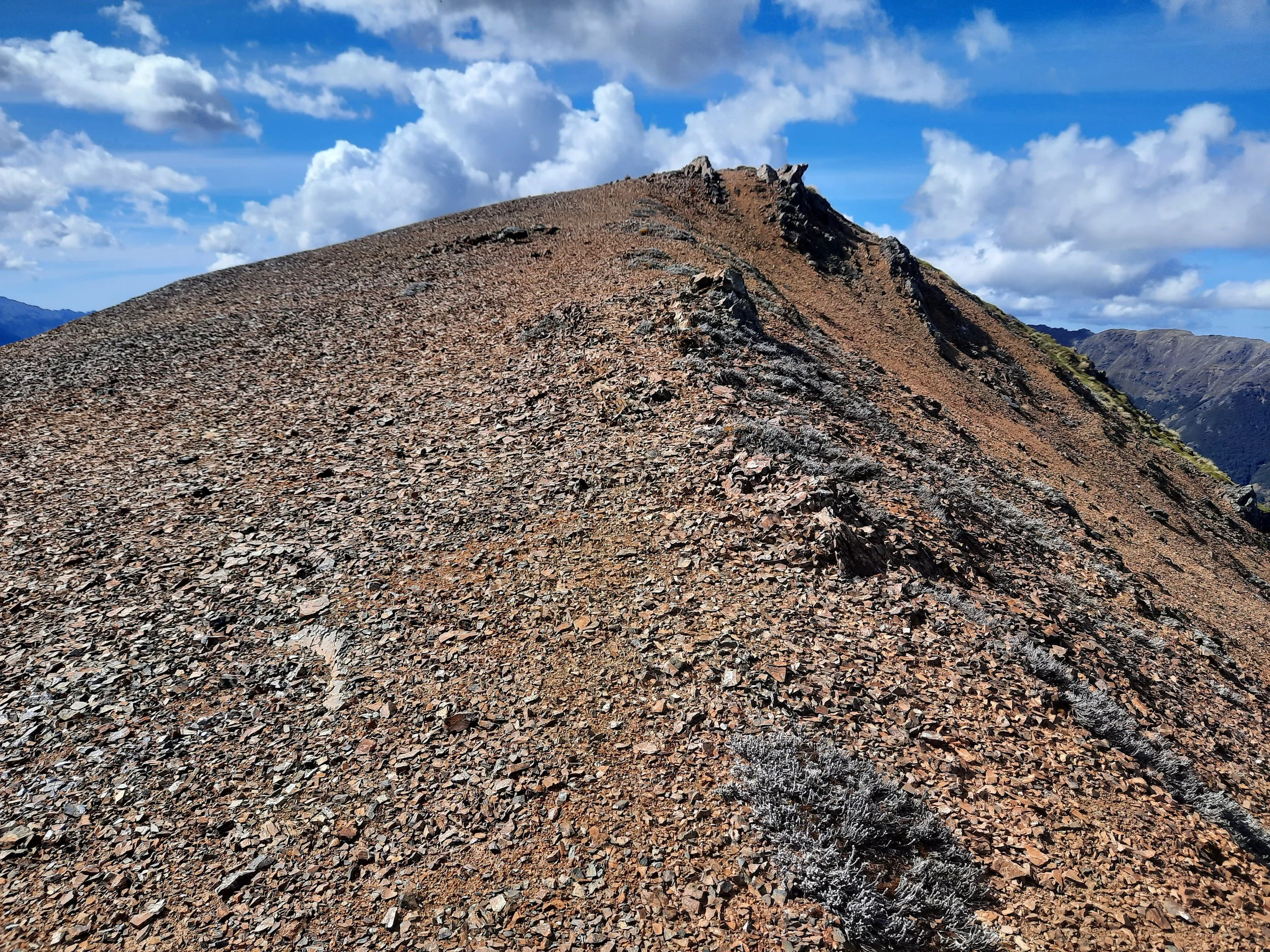 After the final outcropping on the ridge, it was an easy tussock ascent to a gently sloping triangular area, where tussock gives way to loose red rock. I crossed this to reach the summit and went a bit further for the view north, then rested to gaze at Iron Hill across the Cobb River Valley to the northeast. I hiked past the Sylvester Lakes to Iron Hill’s summit three days later.