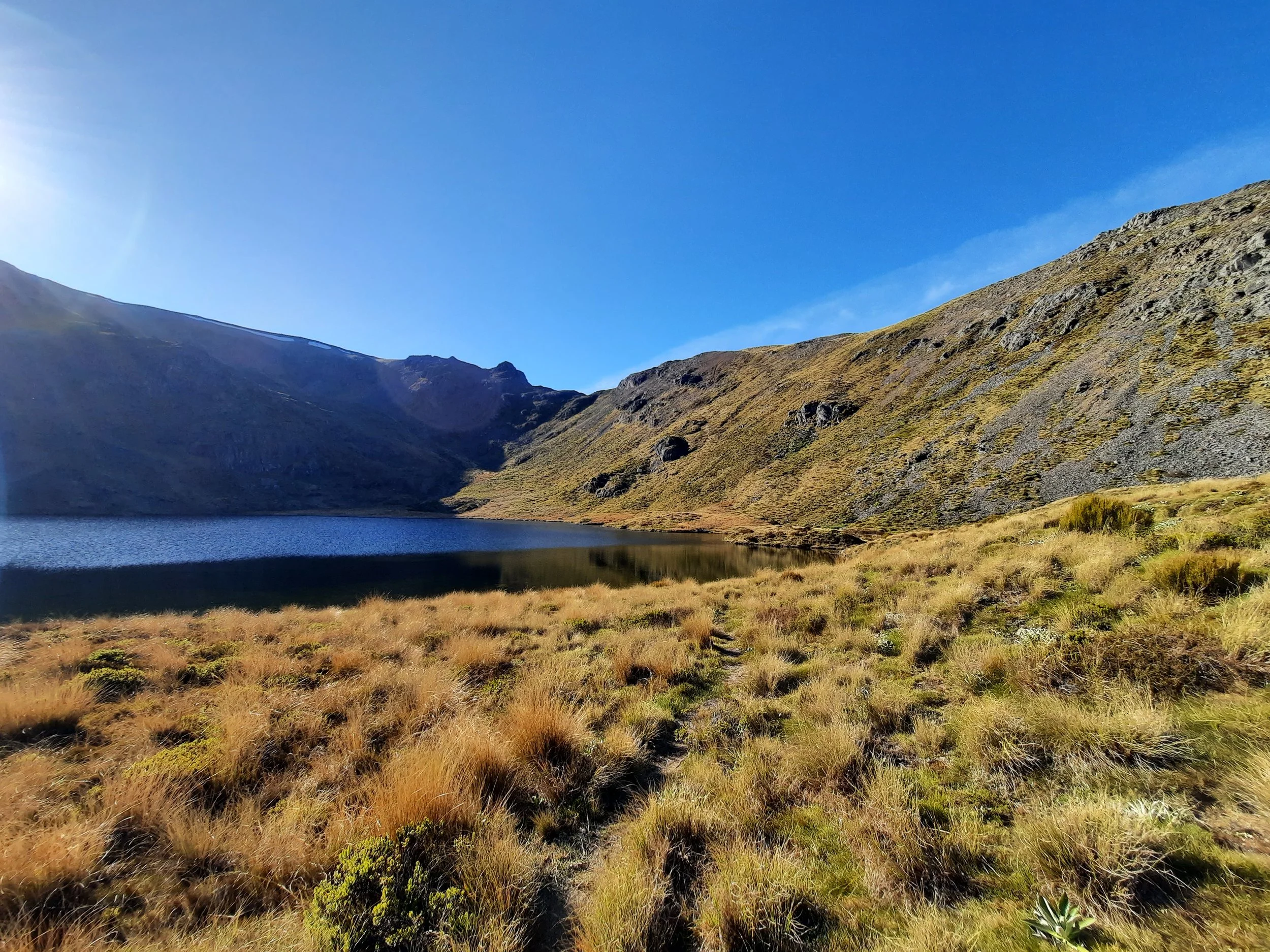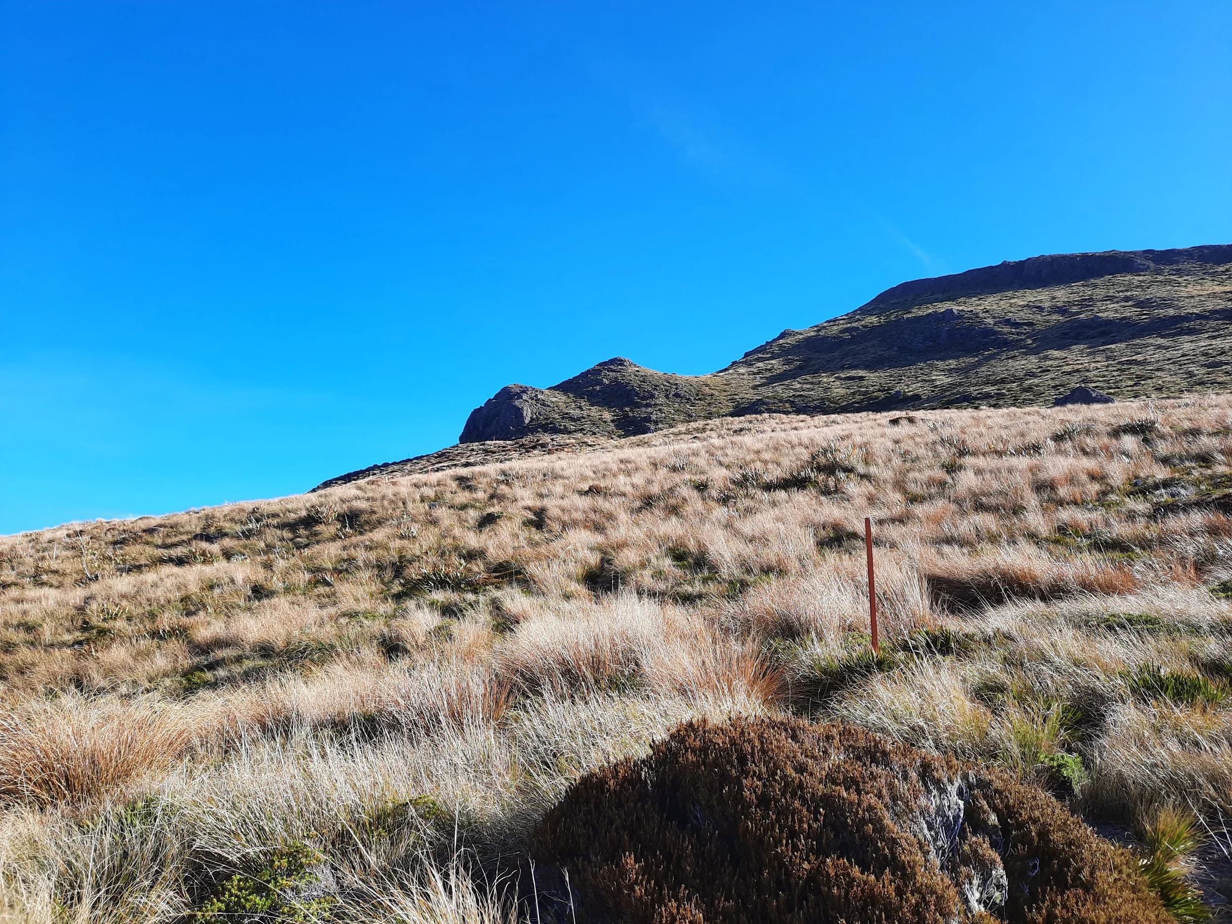 Eventually I reached the tussocky northeastern ridge of the corrie around Lake Peel. There were orange markers the whole way.