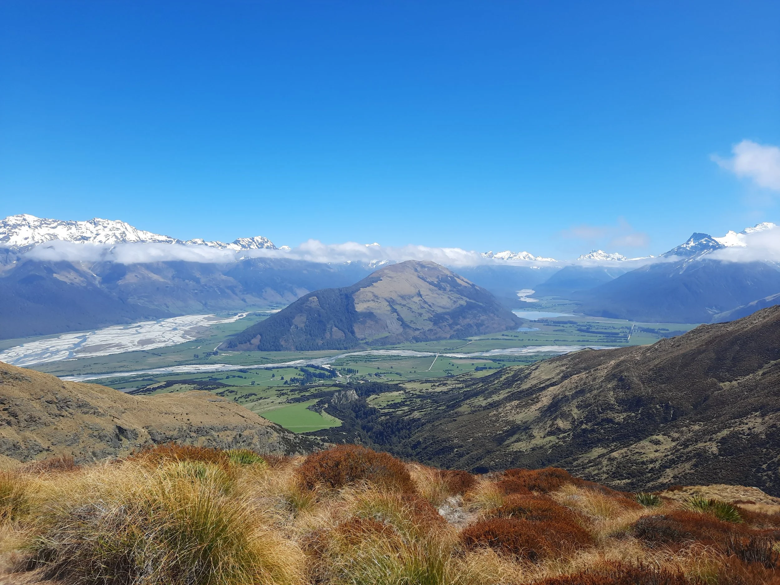 Not far from the Meg Hut Pack Track trailhead, on the opposite side of Cardrona-Crown Range Rd, is Cardrona Ski Field Road. The ski field operators allow summer hiking on Mt Cardrona (https://www.cardrona.com/summer/experience/walking-hiking/). I probably wouldn’t choose to gain nearly 1200m of elevation on a very long ski field road just to start that hike. Similar views are available from the Crown Peak (see the Arrowtown section, just below).