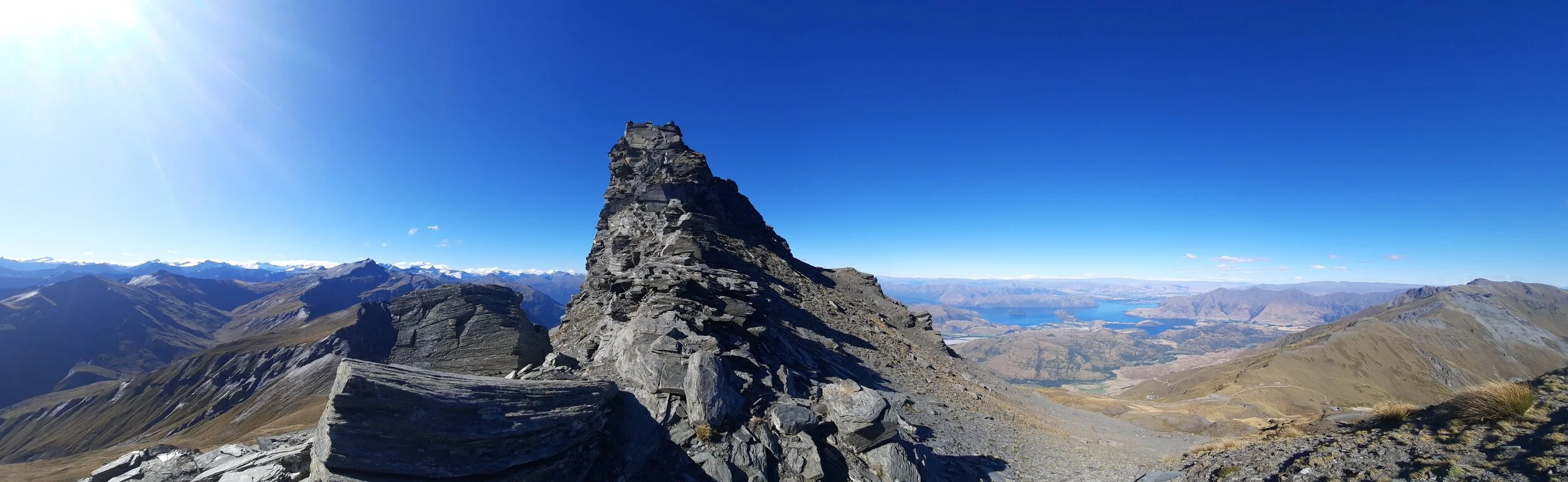 Afternoon panorama from Treble Cone summit. Black Peak at center left. End Peak at far right.
